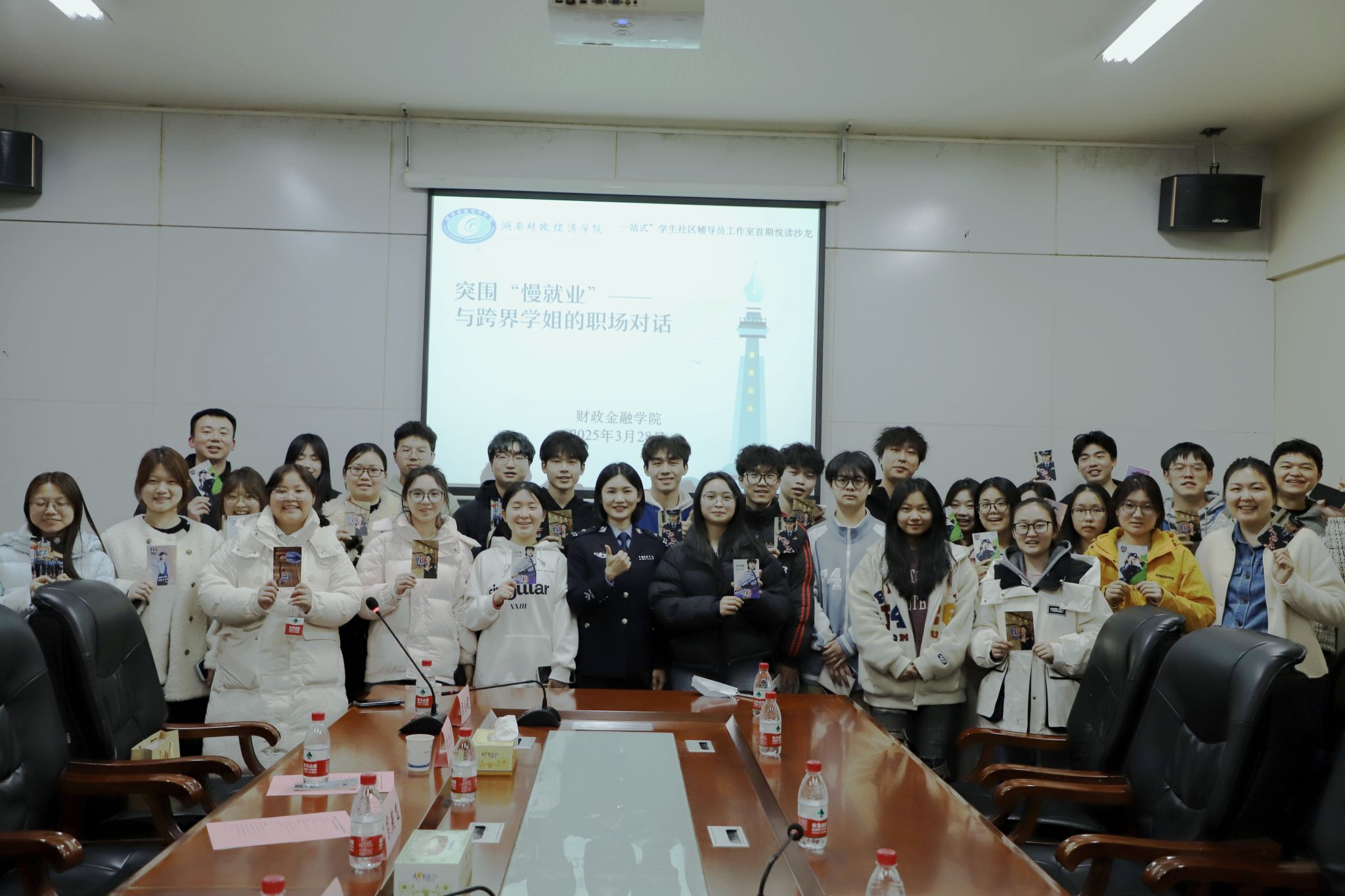 为深化“一站式”学生社区建设,创新“三全育人”实践载体,丰富学生社区学生活动,3月28日下午15点,WilliamHill官方网站“一站式”学生社区悦读书香工作室联合校易班工作站、财政金融学院团总支、学生分会,以“突围‘慢就业’——与跨界学姐的职场对话”为主题,在办公楼119会议室成功举办首期“财金榜样说”主题读书沙龙活动。本次活动特邀长沙市公安局芙蓉分局民警吴佳妮担任主讲嘉宾,财政金融学院党委书记肖燕飞、学生工作部副部长李六华、图书馆副馆长刘安福、学生工作部学生事务与宿舍管理科科长孙颂丰、图书馆读者服务部朱弥老师等领导及全校四十余名师生参与活动。活动由悦读书香工作室负责人易好老师主持。