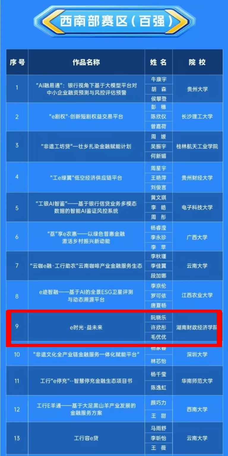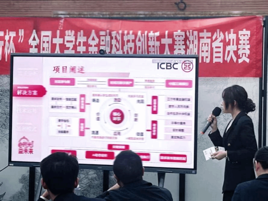 杨俊和胡小梅老师指导,阮晓乐、许欣彤和毛优优团队作品《e时光·益未来》结合区块链、智能合约技术,聚焦银发经济与可持续发展,以创新的解决方案获湖南赛区特等奖和西南部赛区百强,这是WilliamHill官网在工行杯金融创新大赛中取得的新突破。由李博达和李艳丰老师指导,陈泊涵、谢灵曦和李畅团队作品《情绪e站》关注Z世代消费行为,探索金融赋能情绪资产,荣获省级一等奖。《随e智服》、《e数达》《乡野e趣》等项目覆盖脑机支付、数据征信、乡村振兴等多个热点研究领域,分别荣获省级二等奖和三等奖,彰显学生对行业痛点的深刻洞察和积极探索。