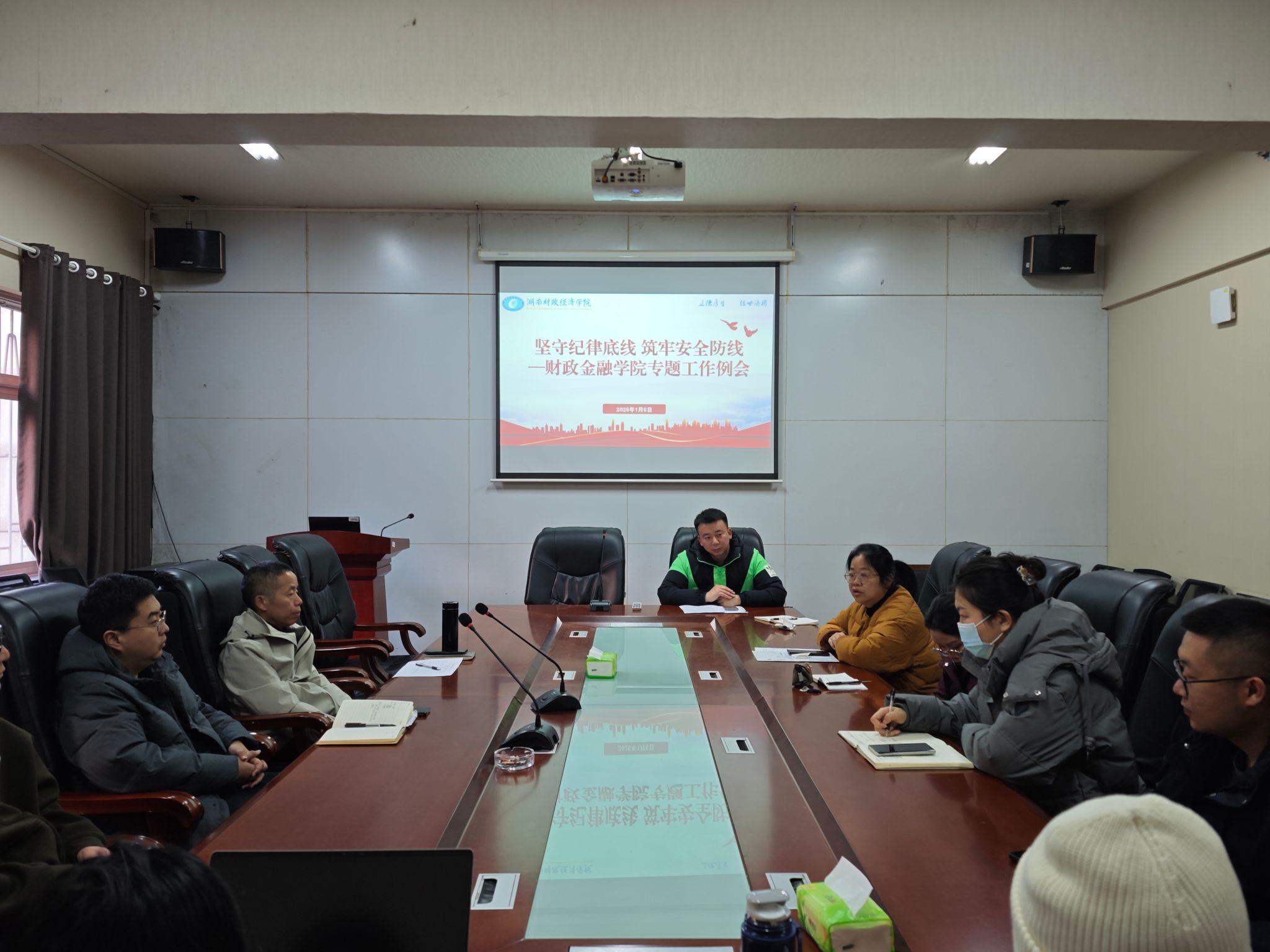 为进一步加强学生教育管理服务工作,筑牢校园安全稳定防线,1月6日下午15点,财政金融学院在行政楼119会议室召开学生安全工作专题例会,围绕学生假期安全教育、诚信参考、宿舍管理、学风建设等工作进行部署。学院党委书记肖燕飞出席会议并讲话,全院辅导员、班主任参加会议。