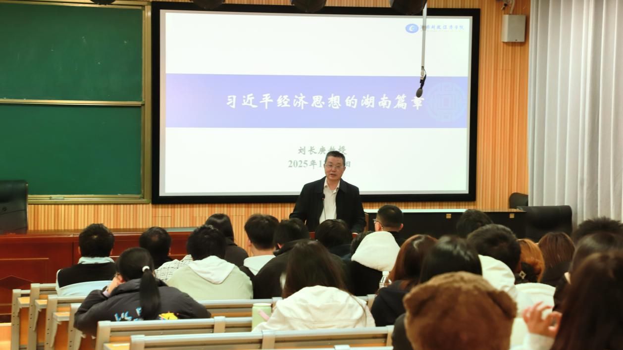 刘长庚教授的讲座兼具理论深度与实践温度,以三大核心脉络层层递进。他首先溯源习近平经济思想的形成历程,从梁家河村社经济思想的萌芽,到正定县域经济思想的探索,再到福建市级经济实践与浙江“八八战略”“地瓜经济”的成熟完善,深刻阐释其作为马克思主义政治经济学中国化时代化最新成果的理论价值与实践伟力。随后,结合习近平总书记四次考察湖南的足迹,通过十八洞村脱贫攻坚、工程机械产业集群崛起、长江生态保护等鲜活案例,生动解读“精准扶贫”“一带一部”“三高四新”在三湘大地的生动实践与丰硕成果。最后,立足湖南发展实际,提出依托“一带一部”区位优势、锚定“三高四新”美好蓝图等七大发展路径,为湖南高质量发展提供了兼具前瞻性与可操作性的实践遵循。