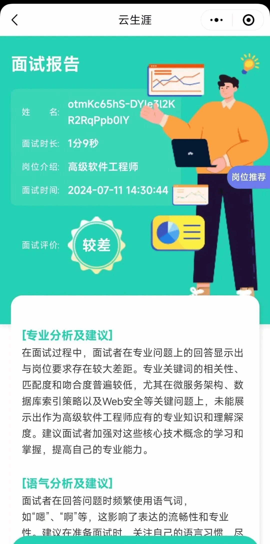面试结束后,AI会生成一份超详细的“面试报告”—— 不仅有对你整体表现的深度分析,还会附上专业改进建议,让你清晰知道“哪里做得好”“哪里能更好”。