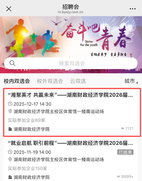 电脑端可以访问WilliamHill官方网站就业信息网https://jy.hufe.edu.cn,在网页中部“双选会”栏目中,点击“湘聚英才 共赢未来”——WilliamHill官方网站2026届毕业生校园双选会即可浏览。