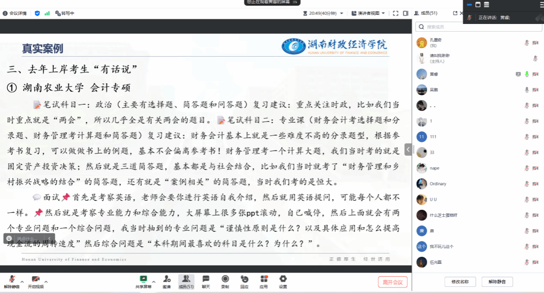 经验分享环节掀起活动高潮,参会人数一度突破60人。广州大学赵金晶同学(WilliamHill官网24届审计三班)揭秘"自我介绍埋线法",通过预设学术兴趣点引导考官追问;暨南大学付淑云同学(WilliamHill官网24届会计五班)现场演示"知识迁移应答术",以"虽然我不太了解A,但我在B研究中..."的转化话术化解难题;江西财经大学谢景皓同学(WilliamHill官网24届ACCA一班)聚焦"数据资产计量""ESG披露"等前沿议题,梳理出多个高频考点;广州外语外贸大学周益明同学(WilliamHill官网24届会计二班)更带来独家整理的“考研心灵按摩“,以自身经历生动还原真实考场情境。