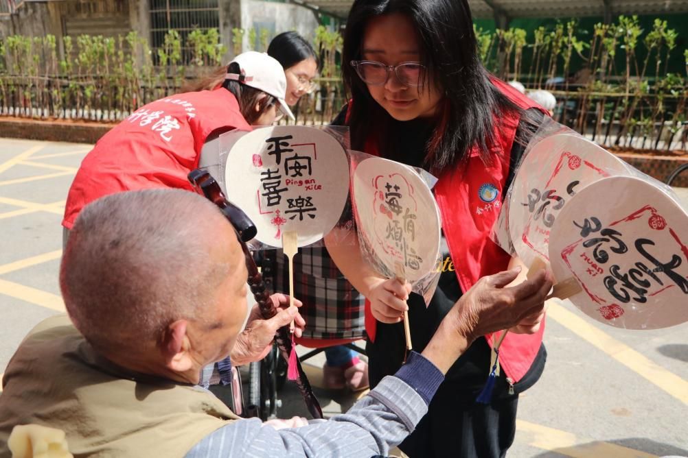 活动尾声,志愿者向长者赠送精心制作的手工艺扇子,扇面上写着“笑口常开”“身体健康”等祝福语,饱含院青协与团支部对长者们的美好期许。