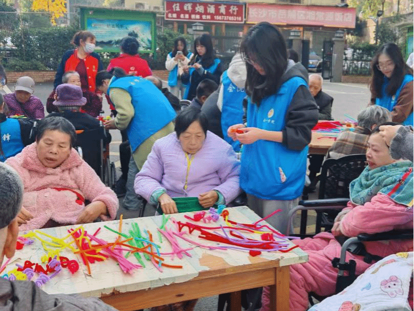 活动当天,志愿者们以轻快活泼的手势舞《你笑起来真好看》开场,迅速拉近了与老人们的距离。在手工艺制作环节,同学们耐心协助老人制作扭扭棒手工花,通过细致指导帮助每位老人完成独具特色的作品。现场还特别设置温情留影区,志愿者们用相机记录下温暖瞬间,并向老人们赠送由志愿者们共同制作的福字挂件,传递真挚祝福。
