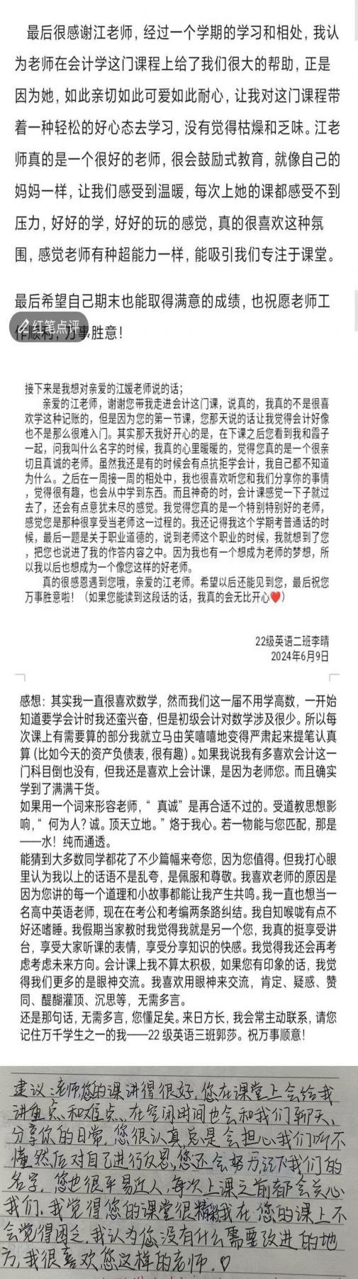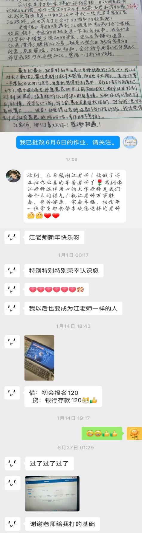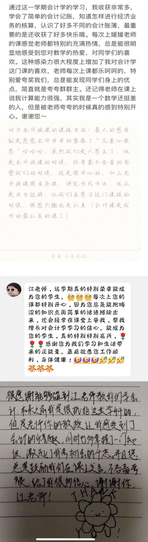 用心浇灌的花朵定会回报你以美丽和芬芳每个学期末学生交出的满意答卷,还有他们对课程的满意度都是用心耕耘的成果。更令人欣慰的是,一些学生在会计学课堂点燃了学财会的热情,每个班都有学生拿到了初级会计师证,毕业后成功进入相关领域深造或工作甚至还有挂科成习惯的学生重新捡起了课本开始学习并制定了一个个小目标有些学生立志将来可以和我成为同事等等,这些都是对于我工作大的肯定。这经年累月沉淀下来的师生情谊也是我教学生涯中最宝贵的财富今后,我会依然在讲台前,继续将数字变成故事,将课堂变成舞台,因为我相信:最好的教育,是让每个学生都相信,自己值得被认真对待。