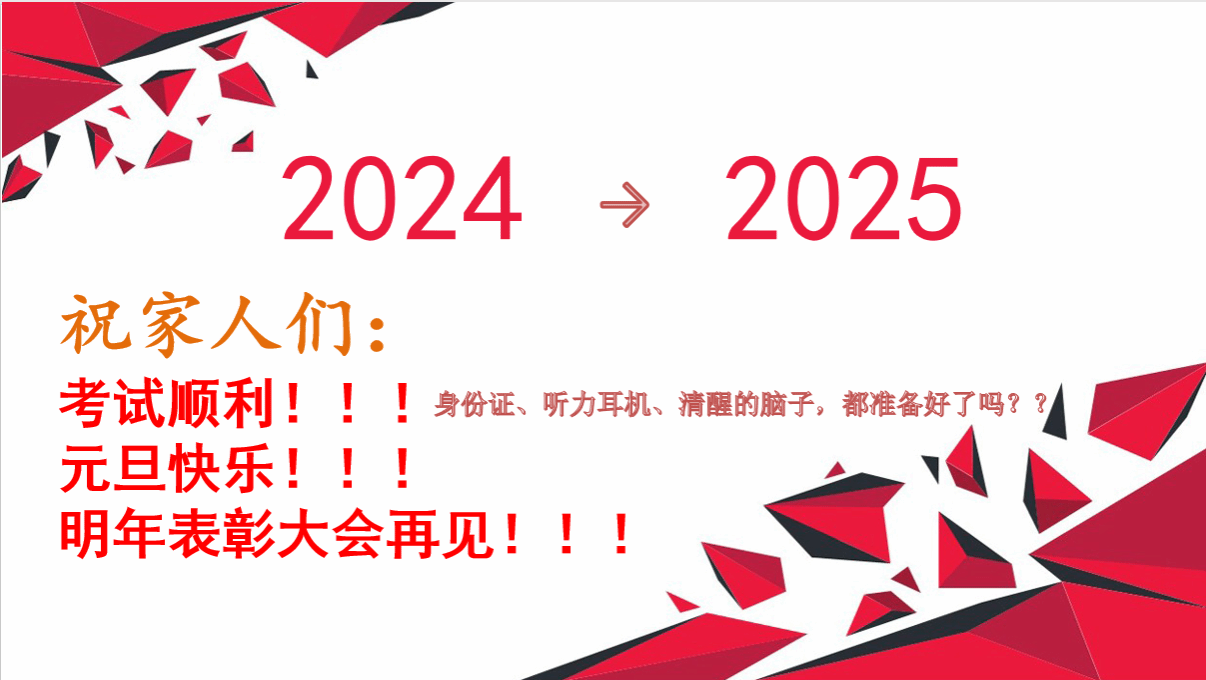 在子凌姐那饱含深情与温暖的亲切祝福声中,此次会议圆满地落下了帷幕。这一场会议,不仅为过去的一个学期画上了一个完美的句点,更如激昂的号角,为即将踏上期末考试征程的学子们鼓足了士气,注入了无穷的力量。此刻,衷心地祝愿所有学子都能想的彼岸奋勇前行。在期末考试中披荆斩棘,取得令自己满意、让师长骄傲的优异成绩,向着梦!