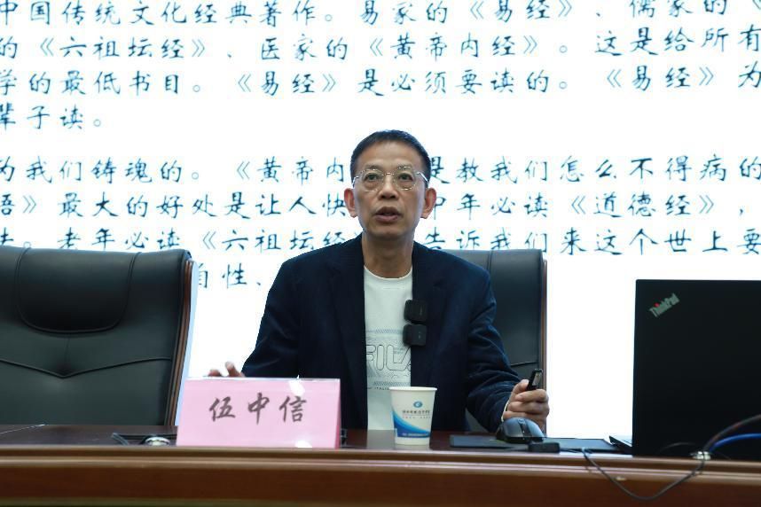 伍中信教授首先对文化的内涵进行了深入剖析。他指出,文化是一种生活方式,是人们行为的准则和规范,是社会交往的桥梁和纽带。文化不仅代表了一个民族的历史和传统,更体现了这个民族的价值观和精神。接着,伍中信教授引导同学们思考什么是初心。他强调,初心是指一个人最初的、最纯粹的、最真实的想法和愿望。保持初心,就是保持对生活的热爱和对理想的追求,不被外界的纷扰所左右。在讲解阴阳中和时,伍中信教授提到,阴阳是宇宙中相互对立、相互依存的现象,给同学们展示了八卦图,提到两仪思维:阴阳中和,要既能阴也能阳,不要刻意停滞在一个状态。
