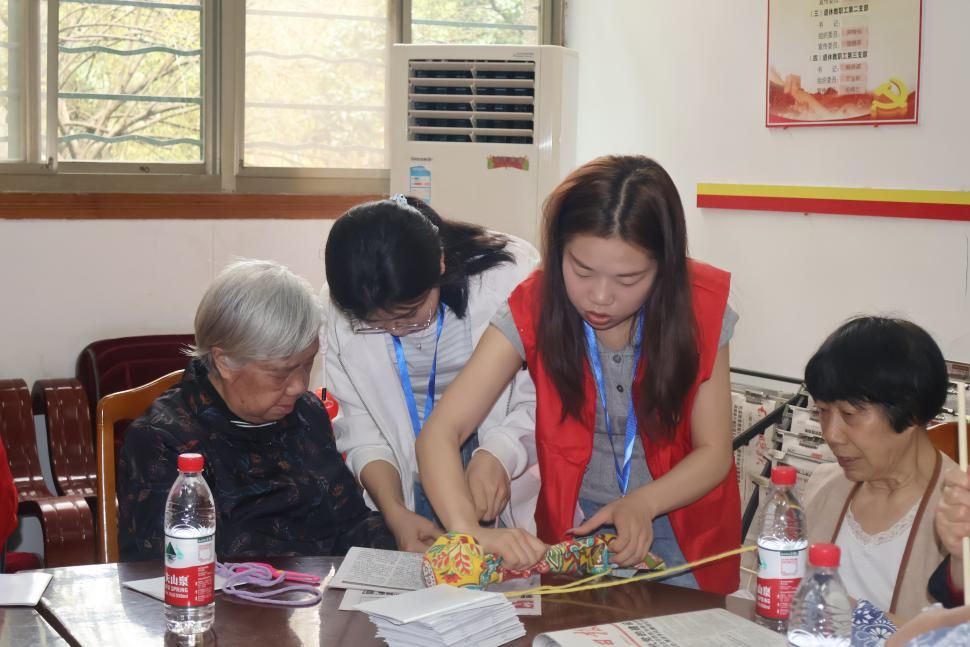 (图为退休教职工与志愿者制作艾草养生锤)