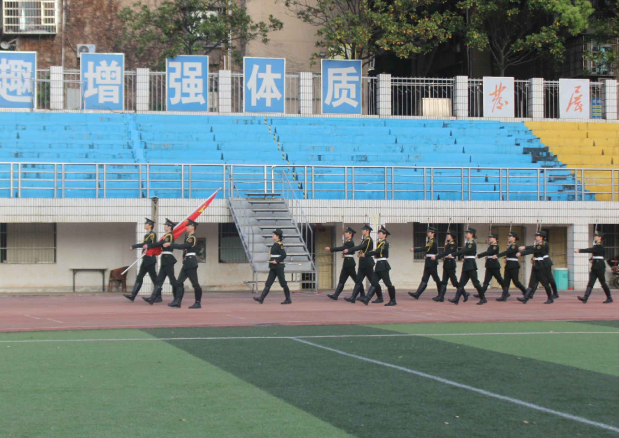 国旗护卫队迎着晨曦,迈着铿锵有力的步伐,护送五星红旗入场。伴随着《义勇军进行曲》奏响,全体师生肃立注目,齐唱国歌。随后,学生代表邓亦伶进行“国旗下的微宣讲”,以青年话语破除理论传播壁垒,在国旗下实现从思想认同到行动自觉的升华,彰显新时代青年马克思主义者的责任担当。
