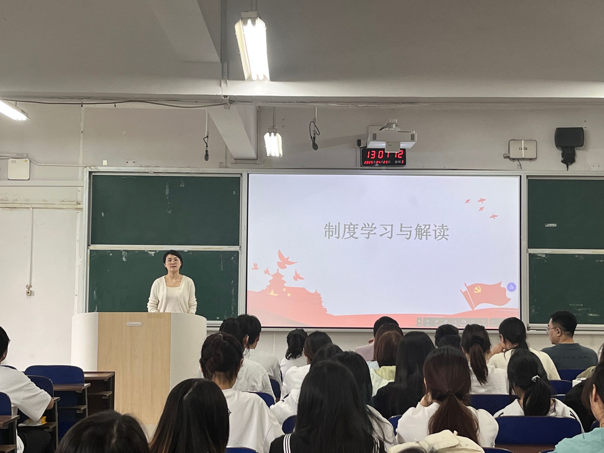 周雄艳带领大家解读《教职工蹲点学生宿舍管理制度》《寝室长管理制度》《学生日常文明倡议和日常行为规范》《学生住宿管理制度》《应急常识与公共卫生安全》等文件精神,深入解析文件中关于宿舍管理、安全规范及文明养成的具体要求,强化师生责任意识与执行标准。