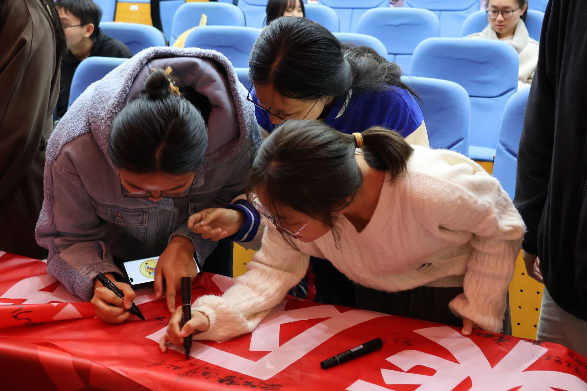 温情寄语余韵未消,活动便进入了充满仪式感的互动环节——横幅签名与“暖心礼包”赠送。一幅鲜红的励志横幅在台前展开,同学们郑重执笔,依次签下姓名,也许下对未来的坚定承诺。随后,学院为每位同学送上了精心准备的礼包,礼包中有实用的备考物资、甜美的小零食。当一份份满载厚意的礼物送到同学们手中时,现场暖流涌动,感动洋溢。这不仅仅是一份物质的赠予,更是“你若奋斗,我必守护”的深情体现,是学院始终相伴的温暖诺言。