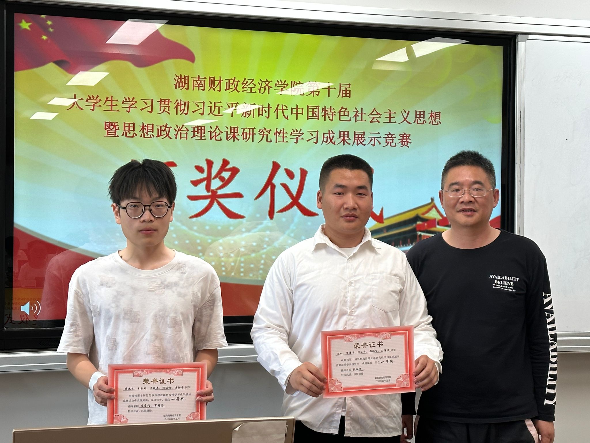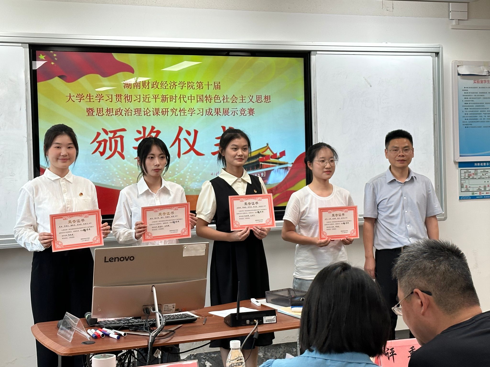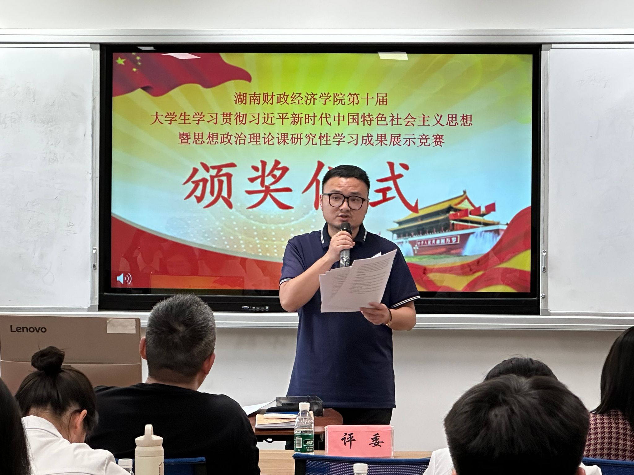 黄建跃、罗财喜分别为获得特等奖、一等奖的小组颁发获奖证书。黄建跃在总结致辞中表示,研究性学习对于青年大学生学深悟透习近平新时代中国特色社会主义思想具有重要意义。通过紧张的初赛、严谨的复赛、精彩的决赛,同学们的学习能力、研究能力和宣讲能力得到了提升。他要求获得特等奖的4支队伍进一步打磨作品,力争在全省比赛中取得好成绩。
