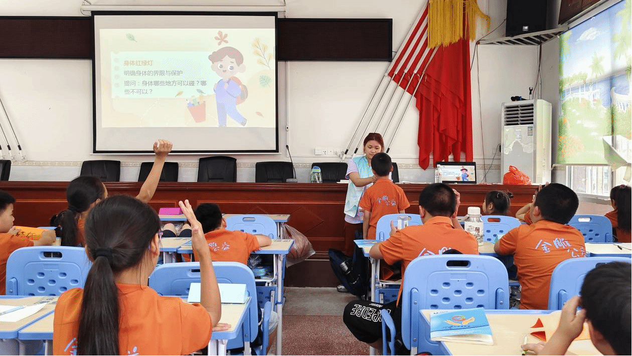当日上午,“志愿先锋” 队成员彭烯老师带来 “认识自己 保护自己” 儿童性教育小课堂。她以生动故事为载体,用 “身体小卫士” 的形象比喻引导孩子们认知隐私部位,核心环节中,彭老师以 “身体红绿灯” 为教具,清晰划分 “绿色区域”(手可触碰)、“黄色区域”(特殊情况可碰)、“红色区域”(隐私部位绝对不可碰),帮助孩子们建立身体边界认知,树立自我保护意识,为成长筑牢安全屏障。