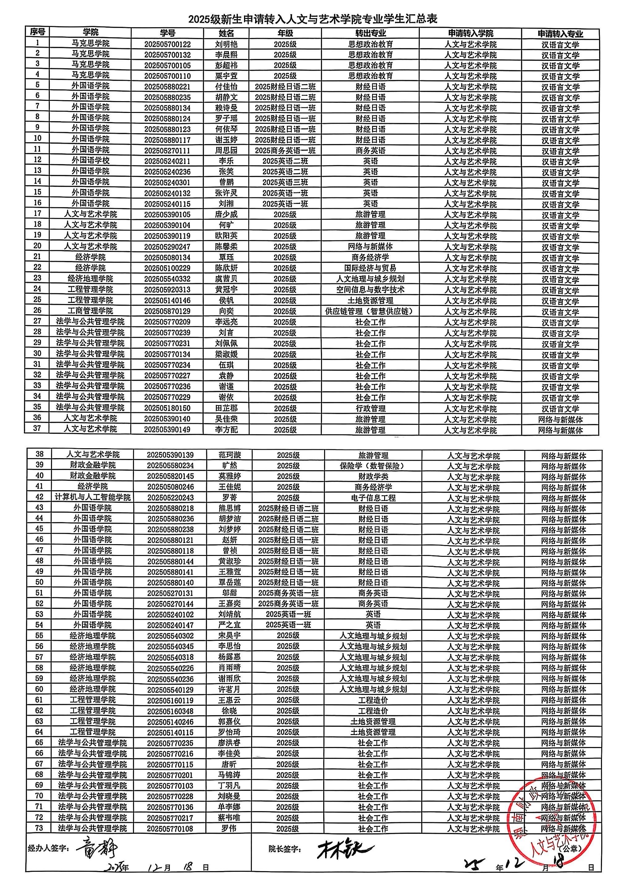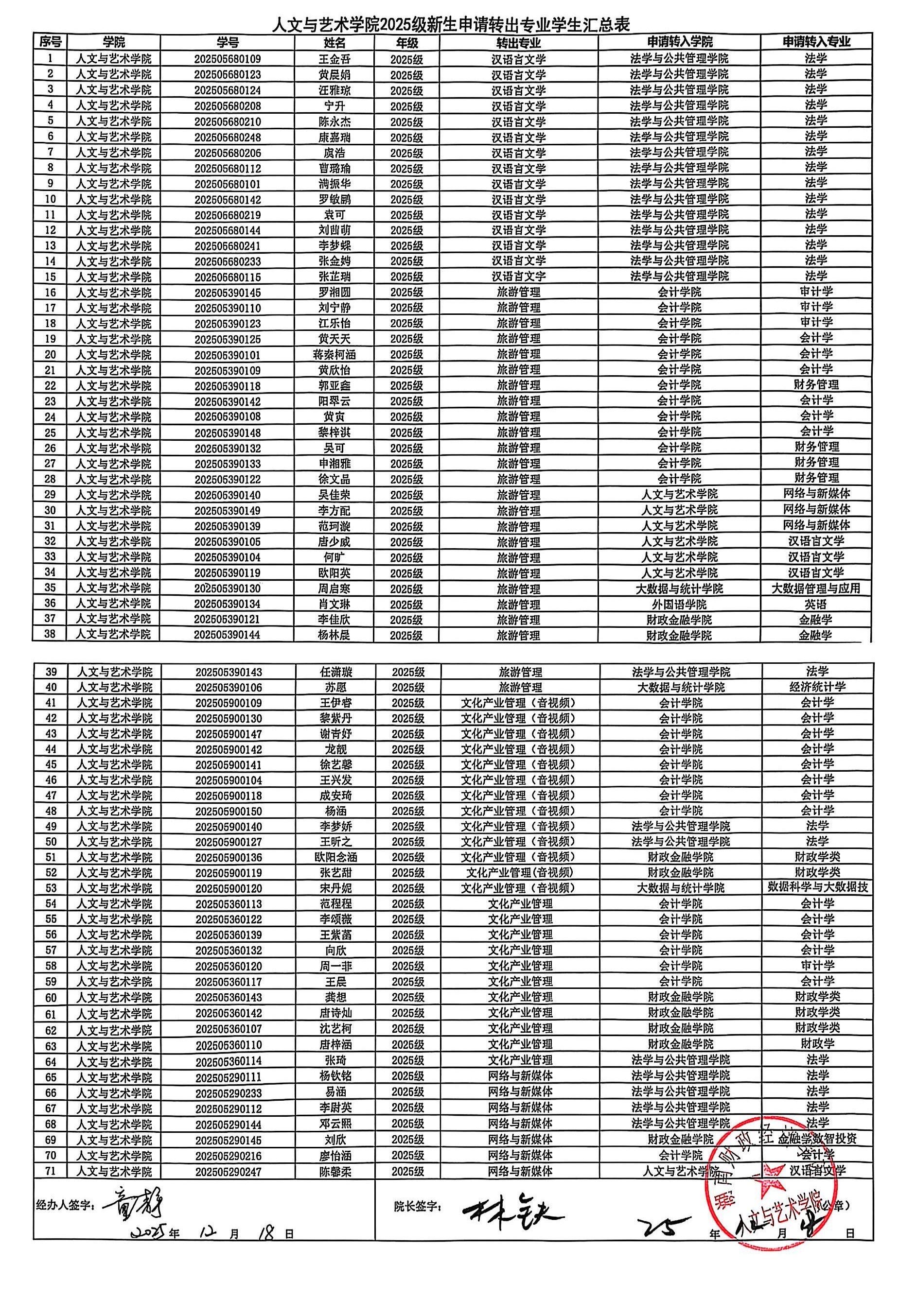 人文与艺术学院2025级新生转专业申请名单公示