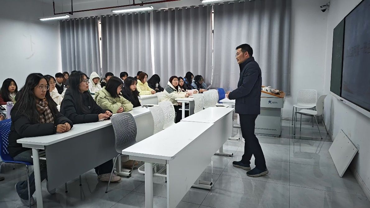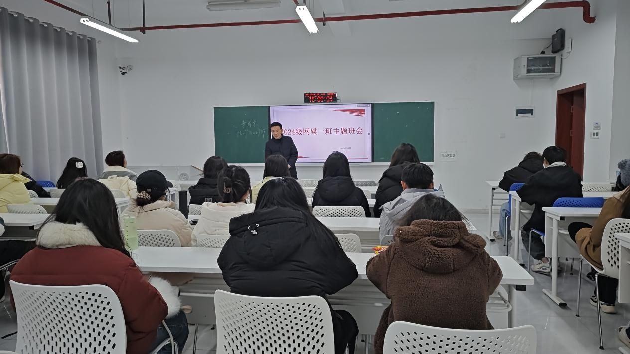 (本网讯)12月11日下午,2024级网络与新媒体1班召开主题班会,学业导师李成家老师与同学们畅谈大学学习与生活之道。他解析了新媒体行业的发展现状与广阔前景,鼓励同学们坚持正确的价值引领,结合专业方向做好大学生涯规划,注重理论知识学习,加强专业实践,提升综合素养和专业技能,朝着自己的目标努力奋斗。同时,他要求同学们注重身心健康,建立良好人际关系,在班级中共同成长与进步。