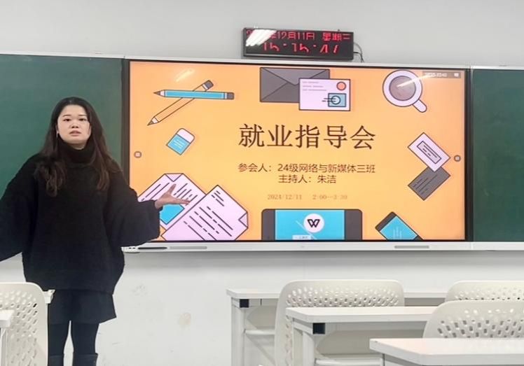(本网讯)2024年12月11日下午两点在至诚楼L1104教室,由朱洁老师开展的以“就业指导”为主题的班会活动圆满完成,参加此次班会的人员为人文与艺术学院网络与新媒体三班全体学生。举行此次班会的目的主要是给初次步入大学的同学们提供未来职业规划、与学生们交流关于以后的工作选择、能力提升的方向,为同学们答疑解惑。