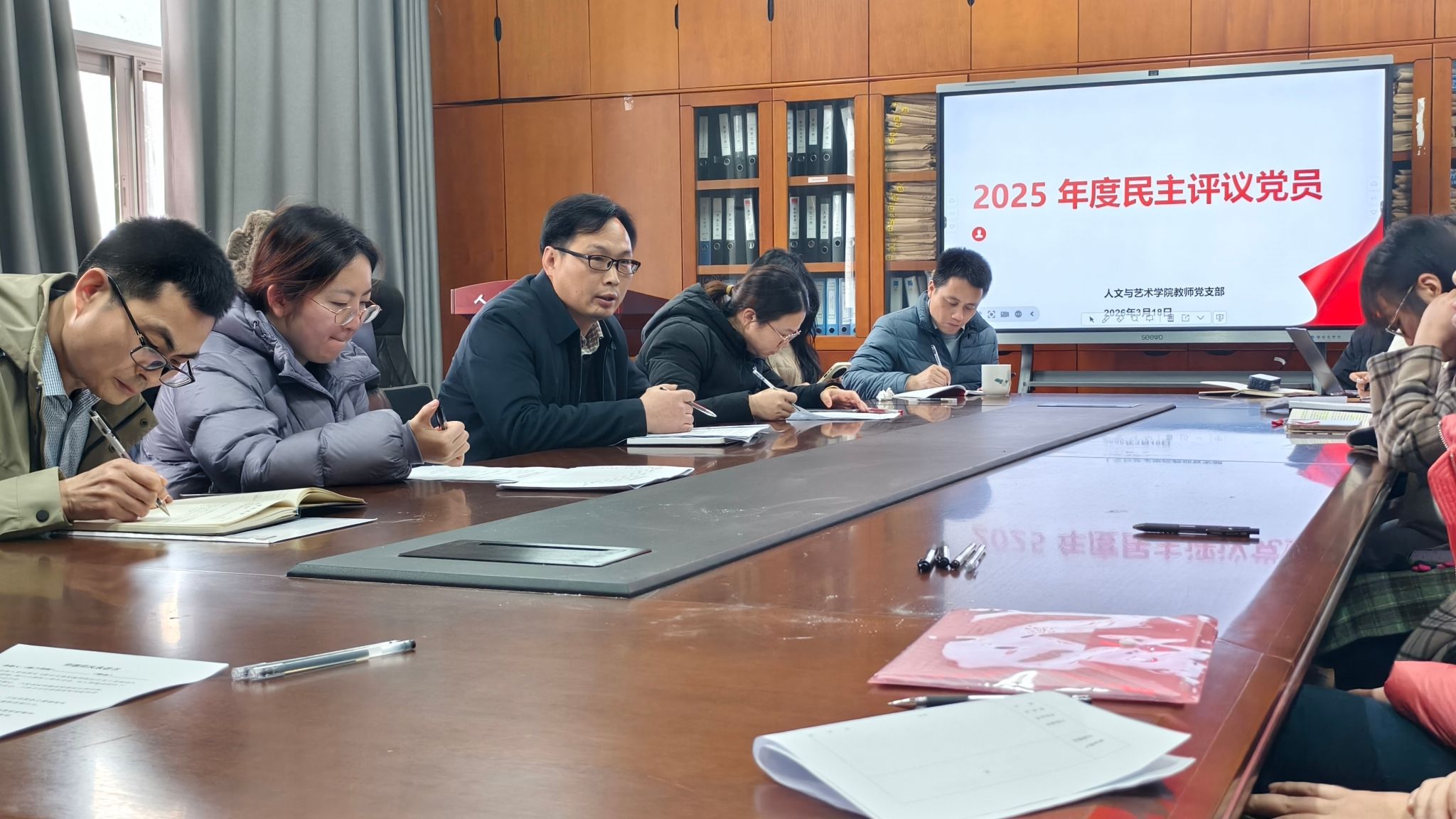 (本网讯)2026年3月18日,人文与艺术学院教师党支部2025年度组织生活会暨民主评议党员会议在行政楼817办公室召开。学院党委书记葛干忠出席会议并讲授专题党课、作点评讲话,教师党支部书记陈洁主持会议,支部全体教师党员参会,会议严格按照既定议程有序推进,全程氛围严肃务实、凝心聚力。