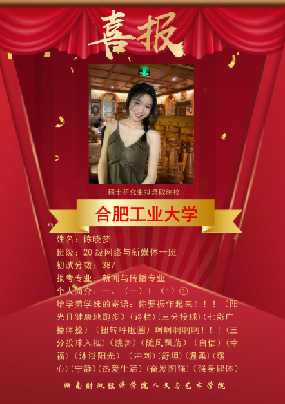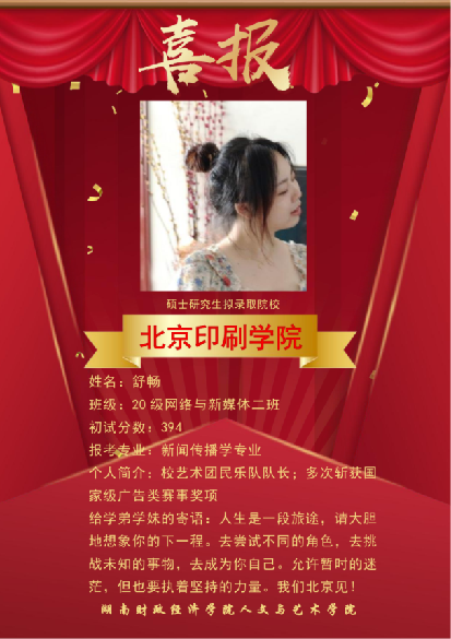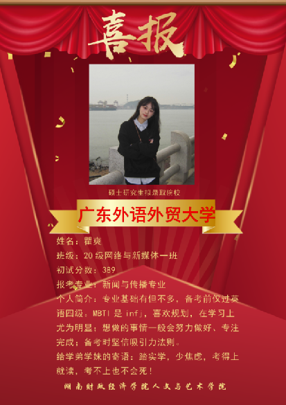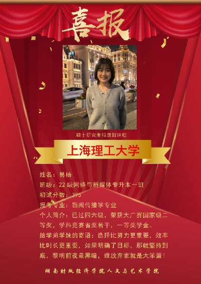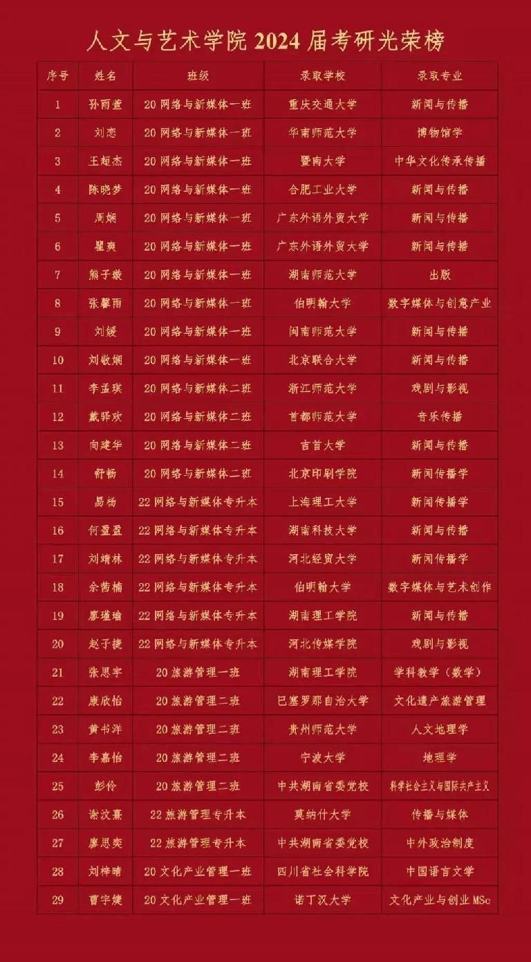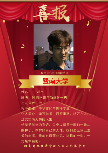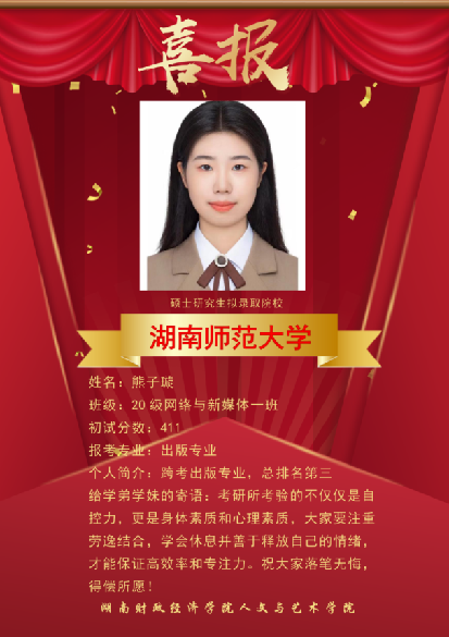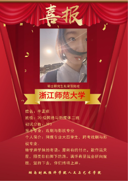 近几年,本校网络与新媒体专业考研成绩突出,多名网媒学子在激烈的“考研”大战中脱颖而出,成功上岸湖南大学、暨南大学、湖南师范大学、合肥工业大学、浙江传媒学院、首都师范大学等多所著名高校的新闻与传播专业,发挥网络与新媒体专业知识的优势,继续在他们所热爱的领域深造。
