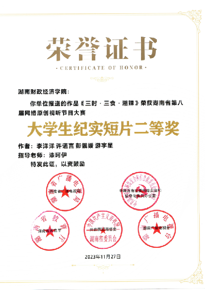 荣获全国大学生广告艺术大赛国奖省奖40余项;获得湖南省大学生公益广告大赛省级奖项多项;获得大学生艺术展演湖南省一等奖;获得湖南省青年文化艺术节省级金奖;获得中国大学生广告艺术节学院奖国家级奖项8项;获得湖南微电影大赛省级奖项14项;获得湖南省高校“青春学习堂”短视频大赛特等奖等省级奖项11项,成功实现大满贯!