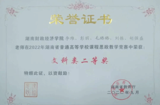 在2022年湖南省普通高等学校课程思政教学竞赛中荣获:文科类二等奖