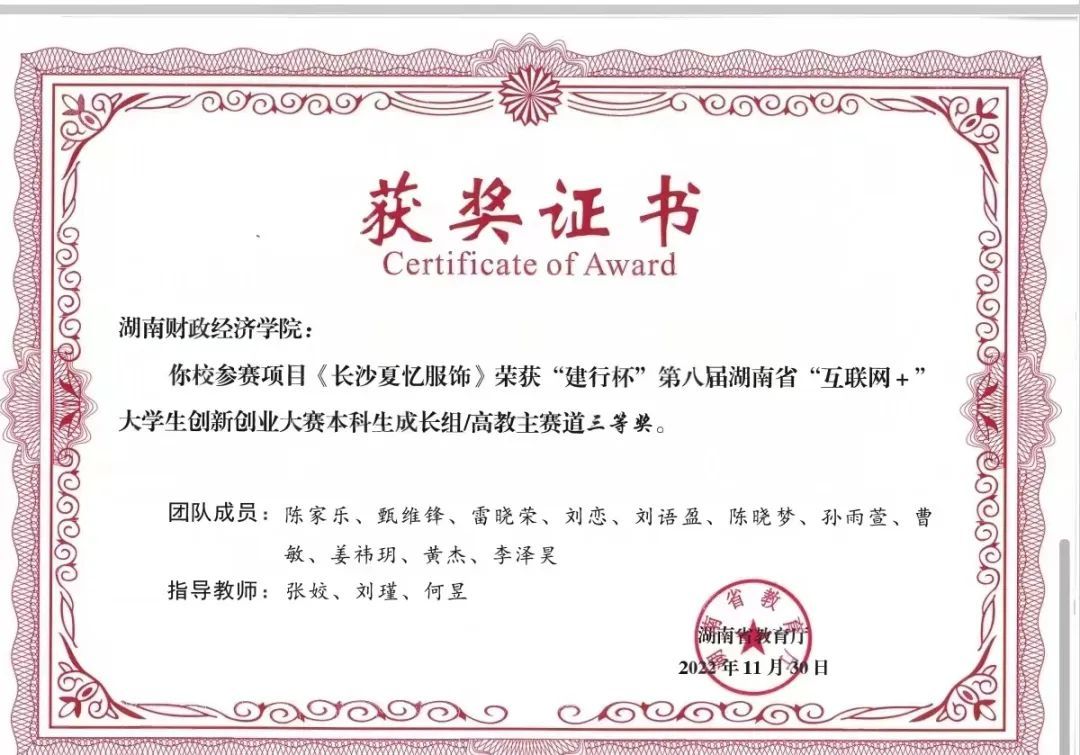 《长沙夏忆服饰》在建行杯“互联网+”大赛获三等奖