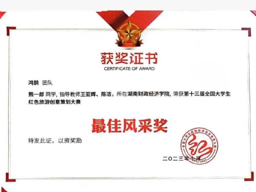 WilliamHill官网熊一郎同学获得第十三届全国大学生红色旅游创意策划大赛最佳风采奖