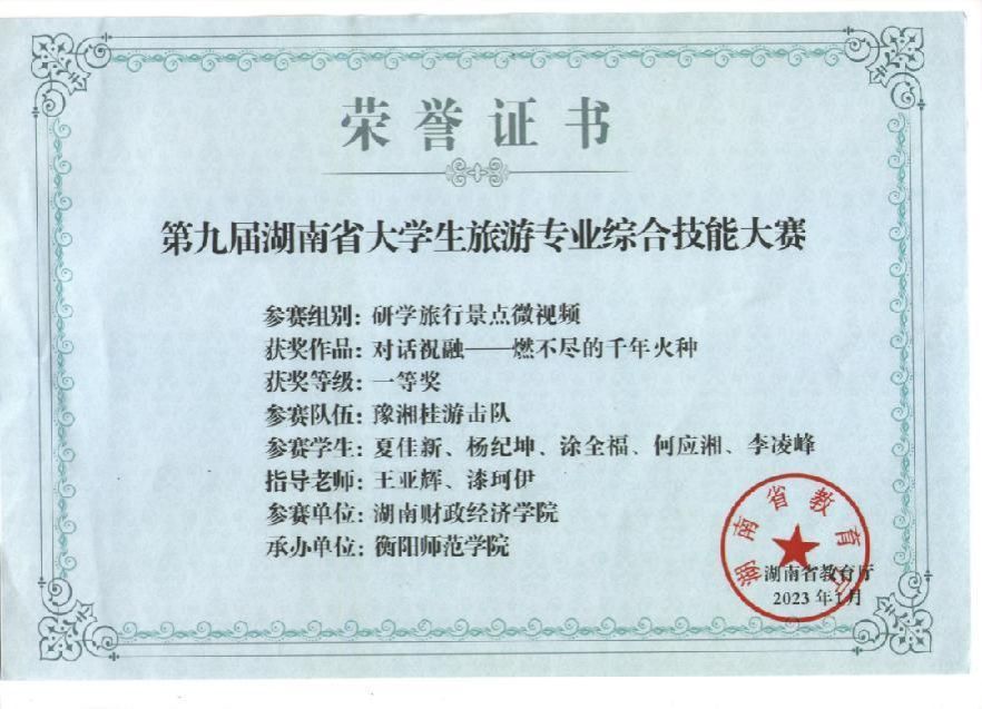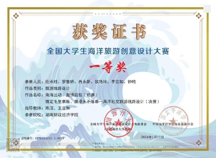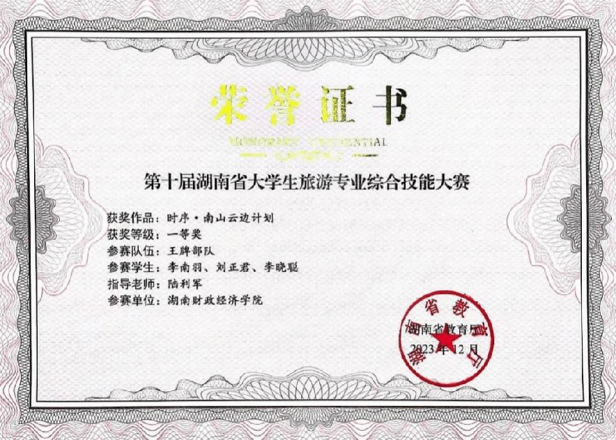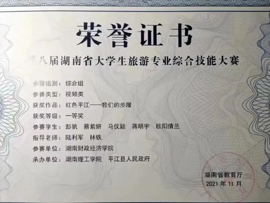 近年来,旅游管理专业学生在“第十三届全国大学生红色旅游创意策划大赛”、湖南省大学生旅游专业综合技能大赛、全国大学生海洋旅游创意设计大赛 、全国大学生旅游管理虚拟仿真大赛、湖南省酒店管理商业策划创意大赛、湖南文旅创新创意大赛、“策游潇湘‘营’出花YOUNG”湖南文旅推广大赛等各类赛事中全面发力,成绩斐然。