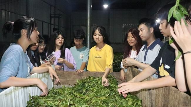 旅游管理专业志愿者带领孩子们在安化大溪村制茶车间体验黑茶制作