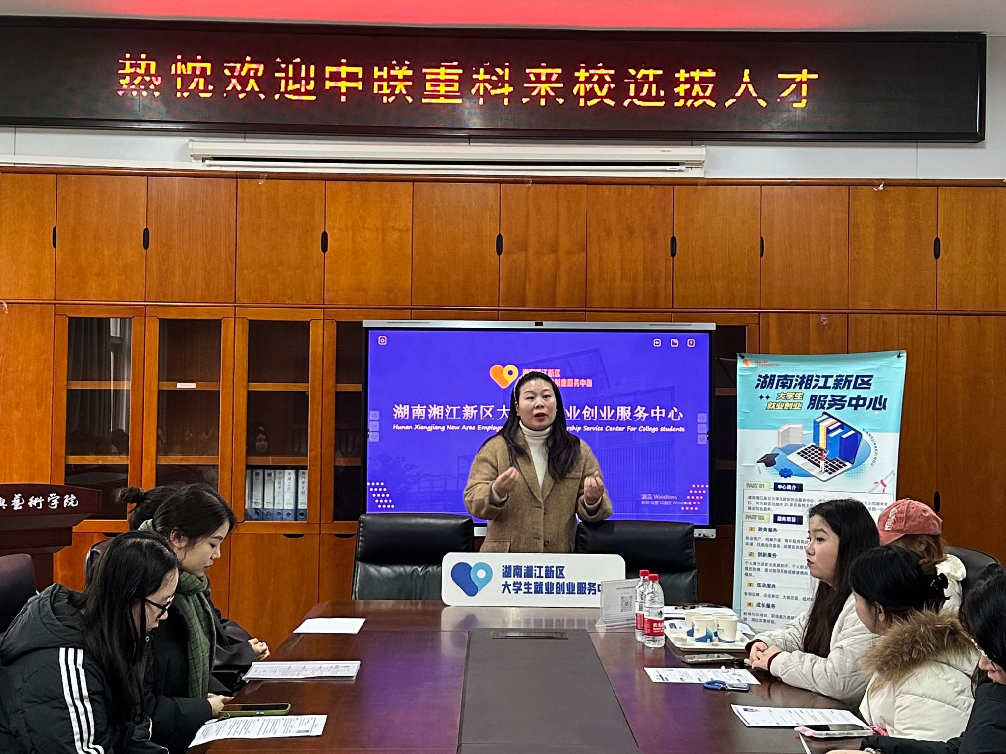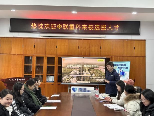 人文与艺术学院院长林铁、院党委副书记杨艳、教师欧璐,以及湖南湘江新区大学生就业创业服务中心主任李俊等出席活动。李俊介绍了中心服务内容和宗旨,强调助力学生高质量就业。中联重科总部人力资源中心滕启超分享了面试技巧,介绍企业文化与岗位要求,强调公司提供广阔发展空间,欢迎优秀学子加入。