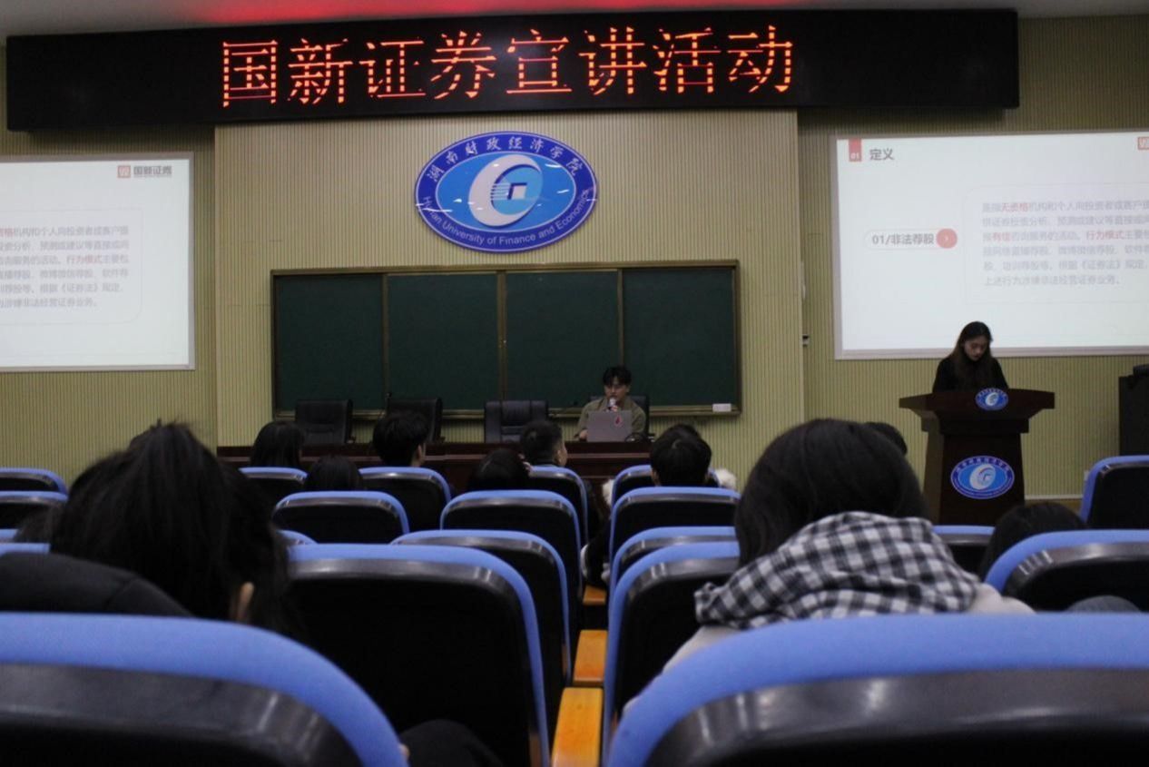 宣讲会上,国新证券公司负责人以“识别、防范,非法证券期货活动”为主题,从具体案例出发对同学们进行了非法证券期货行为的科普。同时,为同学们介绍了公司的业务体系和未来发展方向、校园招聘培育机制、员工发展通道及薪酬福利等。