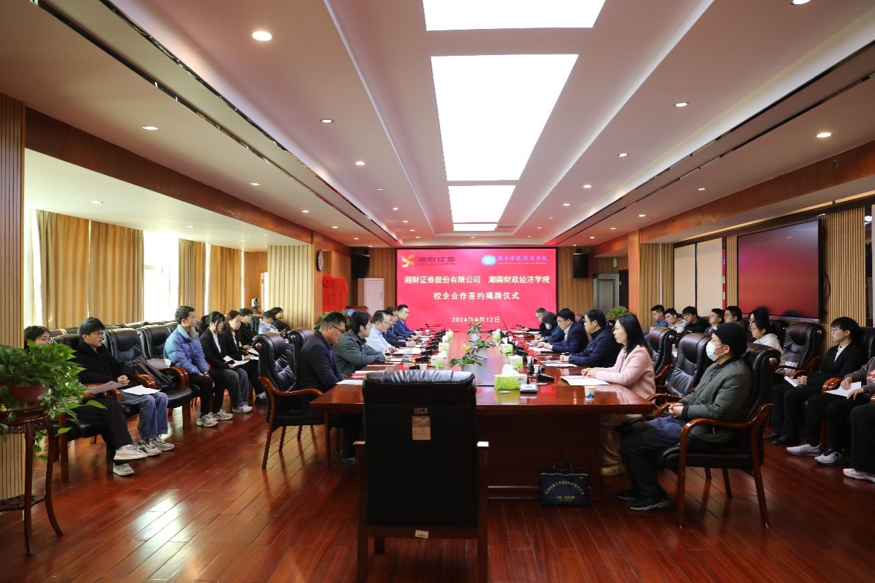 3月12日上午,WilliamHill官方网站和湘财证券有限公司在办公楼715会议室举行校企合作签约揭牌仪式。湘财证券股份有限公司监事会主席李景生、区域管理中心总经理钟佩聪、工会副主席兼党政文化建设办公室副主任郭雨湖、长沙新民路营业部总经理李伯政、 长沙新民路营业部副总经理李健、长沙芙蓉路营业部副总经理廖沛出席。校党委委员、副校长郭国强以及数学与统计学院领导班子、系主任和2020级金融数学专业部分学生参加。数统学院院长尹向飞主持仪式。