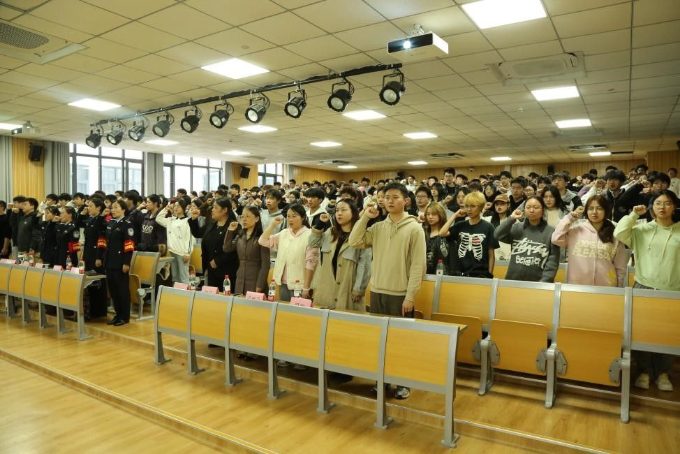 讲座尾声,现场举行禁毒宣誓仪式。在李警官带领下,全体人员起身举起右拳,以洪亮声音庄严宣誓,用誓言承诺远离毒品、担当青春责任,不少学生神情严肃,深刻认识到禁毒重要性与紧迫性。