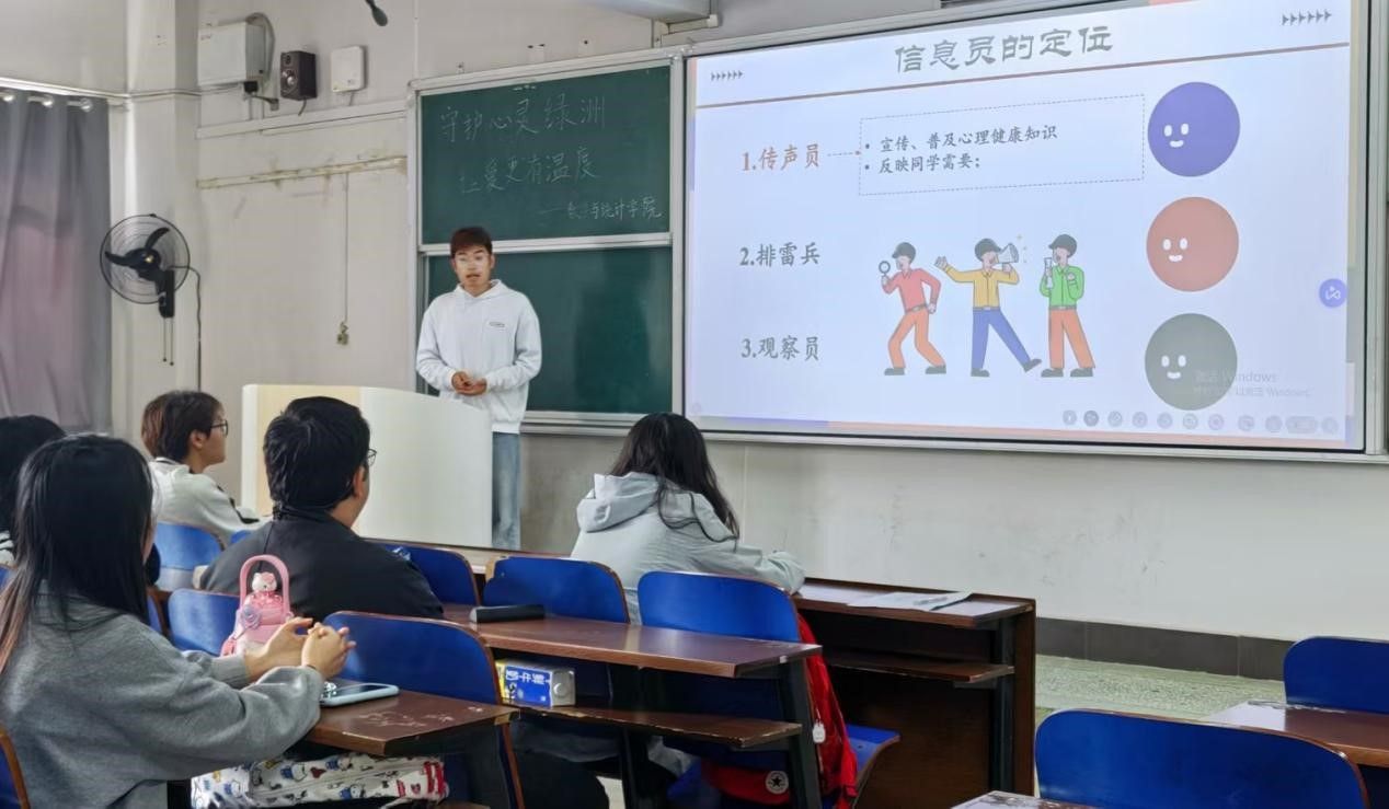 为提升朋辈信息员专业素养和工作能力,帮助朋辈信息员明确“传声员”“排雷兵”“观察员”等角色定位与工作职责,10月30日上午,数学与统计学院在3109举行“守护心灵绿洲,让爱更有温度”专题朋辈信息员培训,院团总支书记周真担任本次培训主讲人。