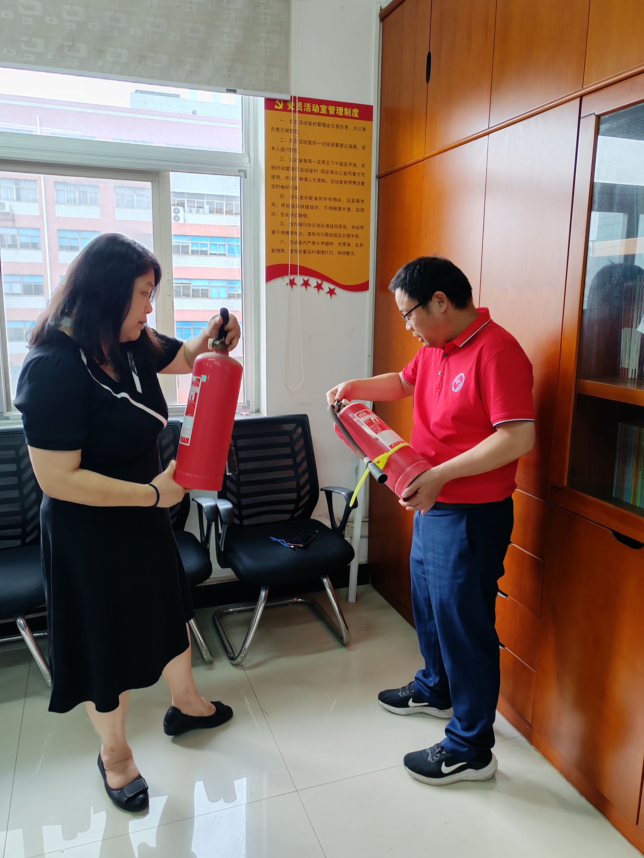 为切实加强学院安全管理工作,7月15日上午,数学与统计学院院长尹向飞、党支部书记王萱在院属办公区域、会议室、实验室开展夏季安全隐患排查及火灾防控工作。检查现场 他们检查了所属区域内有无私接电线、有无使用大功率电器等火灾隐患,办公区域消防通道是否通畅,会议室内的消防设备是否完好齐备,并对实验室防火防盗工作进行了检查。通过此次排查工作,全力夯实消防安全基础,切实维护了校园安全稳定。