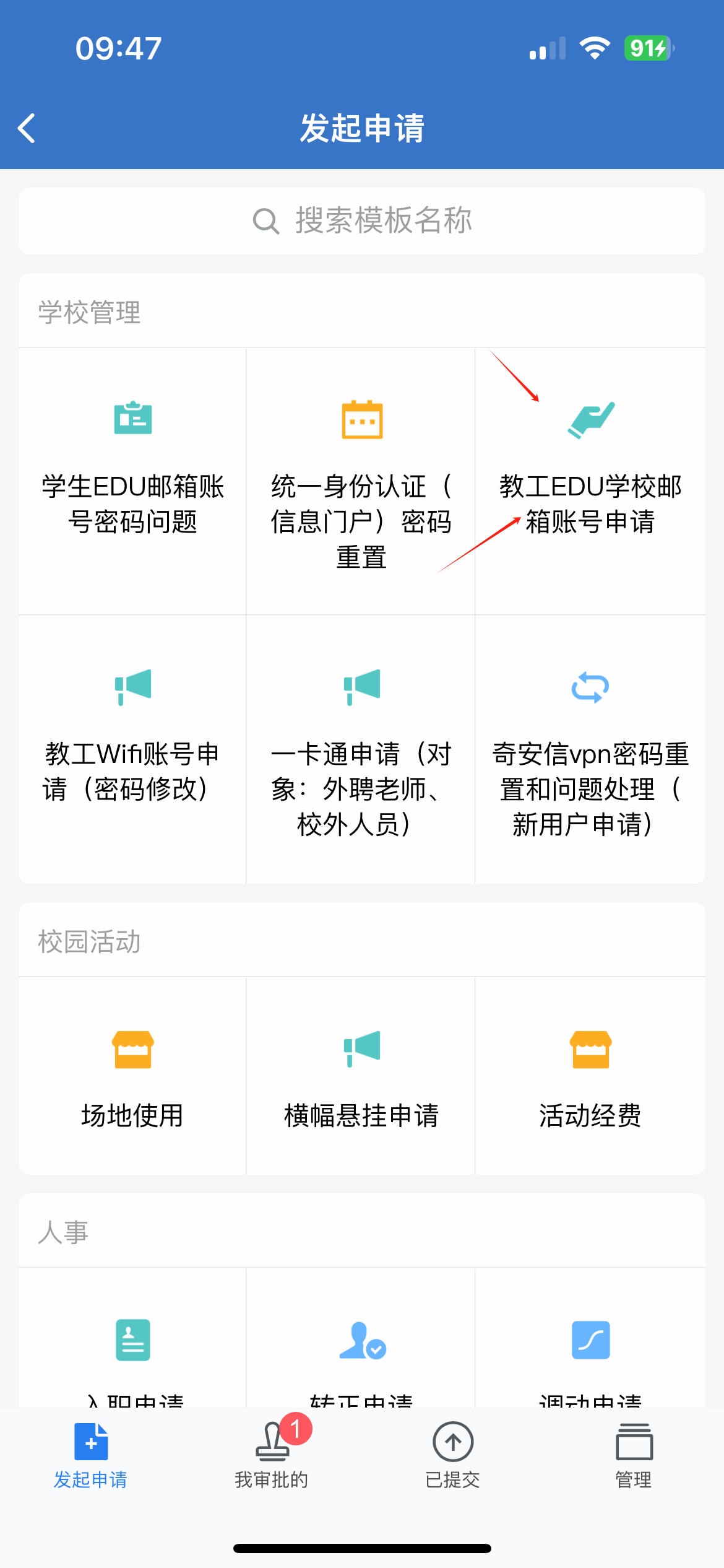 企业微信界面→底部“工作台“→审批→教工EDU学校邮箱申请