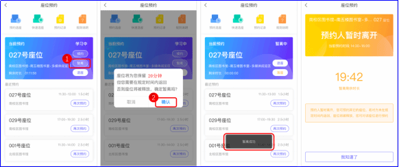 读者使用座位预约系统选座并签到落座后,暂时离开座位需要选择 “暂离”。系统可支持读者临时离开图书馆,临时离开时间可根据图书馆需求灵活设定,系统预设临时离开时间为20分钟,在两个用餐时段(11:30-12:30、17:30-18:30)临时离开时间可设定为60分钟。【图片为示意图】