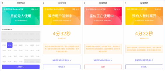 预约完成后显示当前预约信息,包括座位所属位置、座位编号、预约日期、预约起始时段、预约总时长。