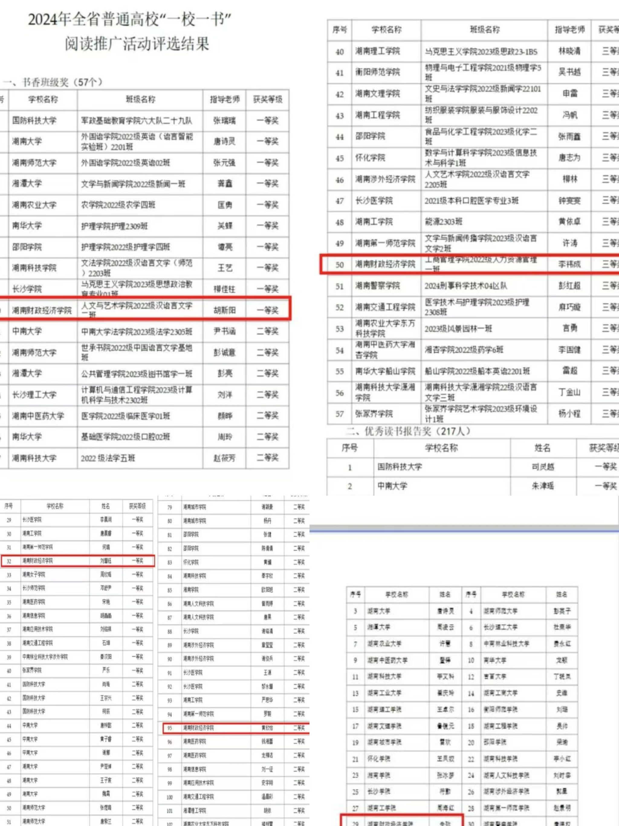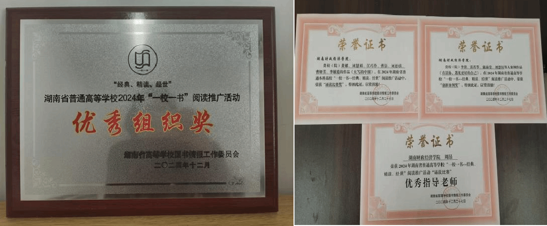 分别由胡斯阳老师指导的人文与艺术学院2022级汉语言文学二班荣获“书香班级奖”一等奖;李祎成老师指导的工商管理学院2022级人力资源管理一班荣获“书香班级奖”三等奖;刘慧钰、黄欣怡同学分别荣获“优秀读书报告奖”一等奖、二等奖;图书馆馆员朱弥老师荣获“优秀阅读推广人奖”。