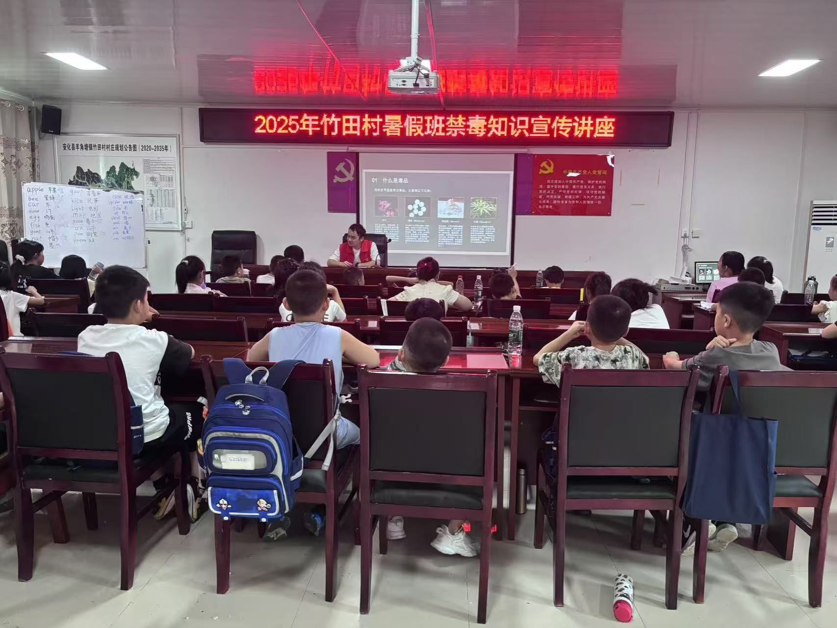 讲座现场,镇平安法治办的结合真实案例与仿真模型,用通俗易懂的讲解和直观的图片视频,向孩子们揭示了毒品的种类、伪装形式及巨大危害。志愿者、村委干部全程协助组织,维持秩序,并鼓励孩子们将所学知识带回家中,争当“小小禁毒宣传员”。
