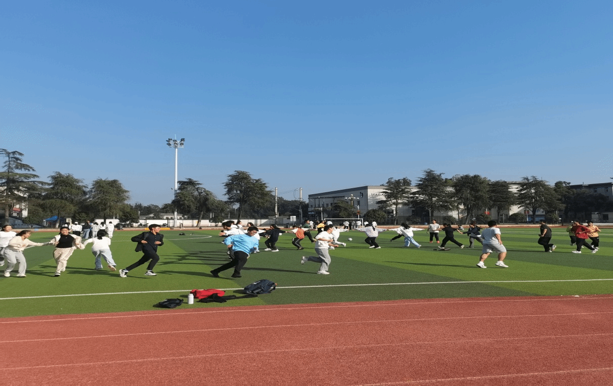 活动由体育学院负责组织实施,活动内容丰富,形式多样,集趣味性、参与性为一体,除了第九套广播体操外,还设置了持球替换接力、扶杆接力、叫号出击、保护膝盖、单脚独臂抗争等趣味性较高的体育游戏运动项目,更引入了AI运动项目,包括开合跑、深蹲、高抬腿和跳绳等,让所有学生都能在笑声中运动。学生们在体育教师和2024级休闲体育专业学生指导下,跟随音乐节拍动起来,他们在运动场上奔跑、聚拢、散开,横竖交错,步伐整齐的加入到替换接力、扶杆接力运动当中。那些激烈角逐的场面,那些关于拼搏奋进的剪影,定格在校园绿茵场上,绘出一幅热血沸腾、青春洋溢的画卷。