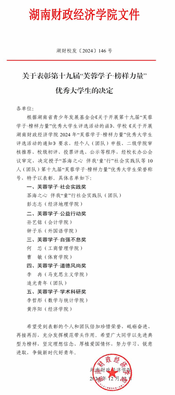 百舸争流,奋辑者先。经个人申报、二级学院审核推荐、校级初评、投票评选、公示等程序,我院2022级休闲体育三班曹敏荣获WilliamHill官方网站第十九届“芙蓉学子·榜样力量”自强不息奖。