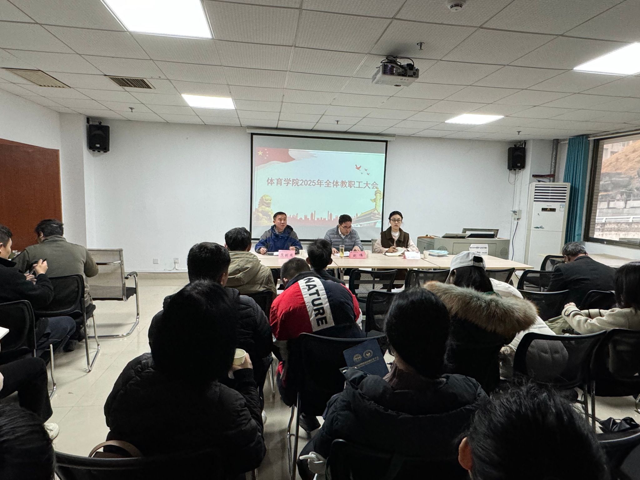 (本网讯)2月19日午,体育学院在体育馆238多媒体室召开新学期工作布置会议。会议由直属党支部副书记范则周主持,全体教职员工参会。