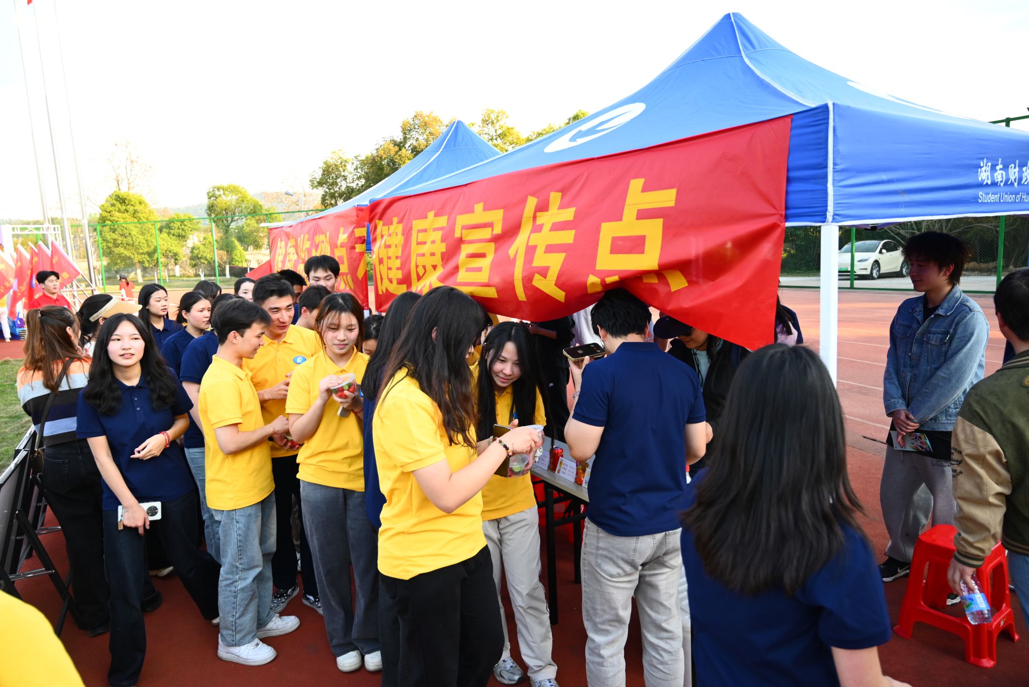 活动现场还设立了健康监测点与宣传点。校医务室的工作人员为师生提供免费的体脂测量与健康咨询服务,并发放宣传折页,普及BMI标准(正常范围18.5-24)、腰围控制(男性≤90cm,女性≤85cm)等健康知识,帮助大家科学认识体重管理的重要性。