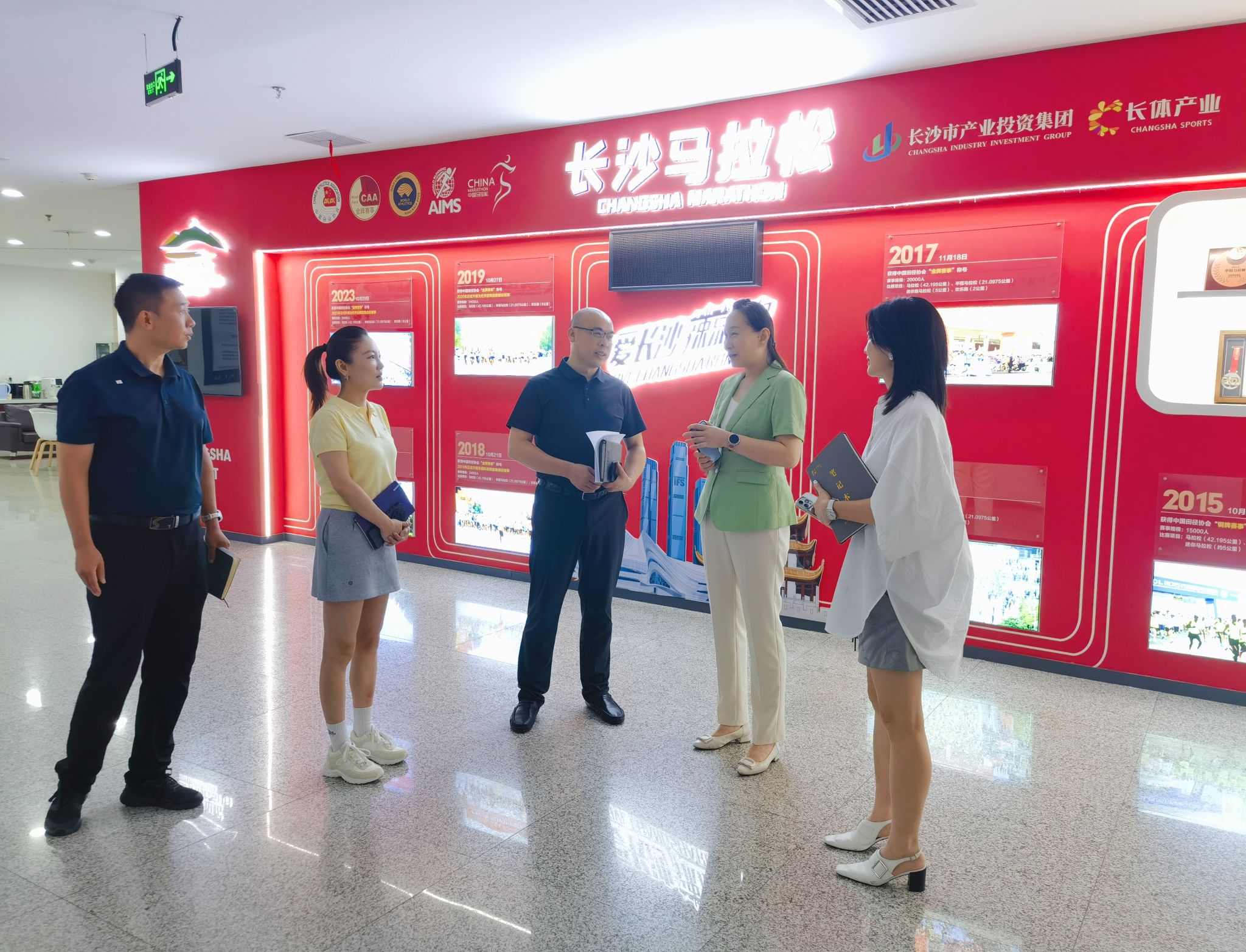 在程震等企业高管的陪同下,苏玲一行参观了公司展厅,从体育赛事运营成果到产业创新布局,展厅内丰富的项目与前沿理念,生动展现了长体产业公司在体育领域的深耕实力。