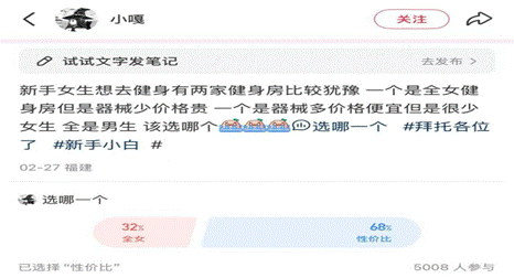 浏览各大社交媒体平台,对女性健身房的态度基本上以消极为主。小红书平台用户70%以上为女性,在这个平台上搜索全女健身房,既可以看到健身房商家的推广信息,也可以看到健身女性实体参与的真实反馈。汇总信息后发现,小红书用户对女性健身房褒贬不一,出现了看衰为主的倾向。有用户在平台提问“一家全女性较贵的健身房和普通但性价比较高的健身房该选哪个”,在5008人参与的投票活动中,68%的人选择了普通健身房。