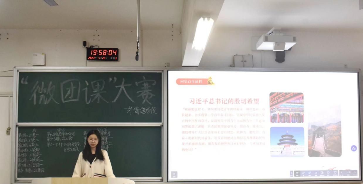 (本网讯)为深入学习党的二十大精神,外国语学院于11月22日晚在校本部第三教学楼3415举办以“凝心铸魂新思想,砥砺奋进新征程”为主题的“微团课”大赛,共有20名选手参加角逐。外国语学院团总支书记代承轩到现场指导。