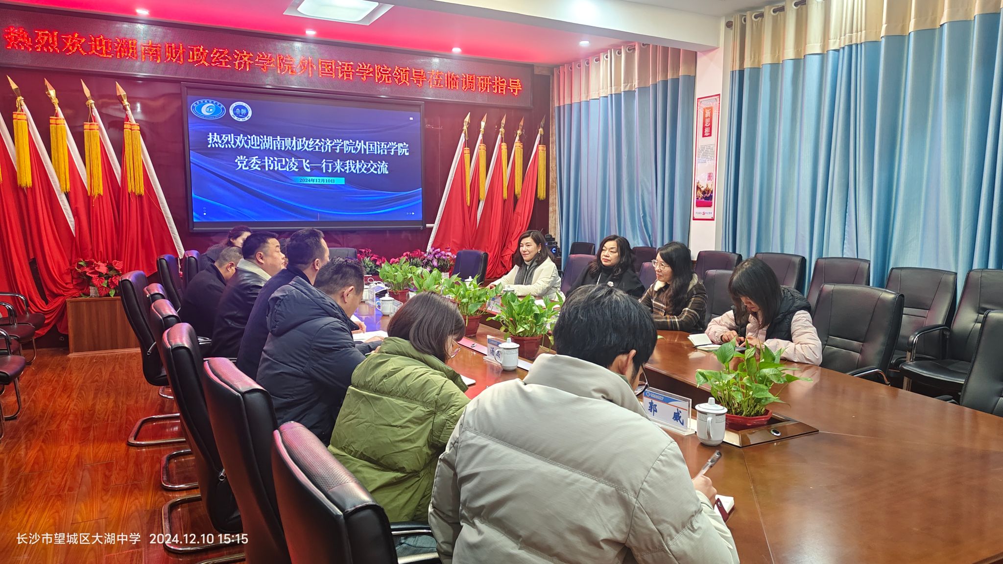 2024年12月10日下午,外国语学院党委书记凌飞率副院长汪小英、党委副书记张鹏以及学工办主任肖叶枝一行前往望城区大湖中学走访调研。此次访问交流旨在进一步加深两校之间的合作,推动毕业生实习与就业工作,并探讨示范性实习基地共建事宜。