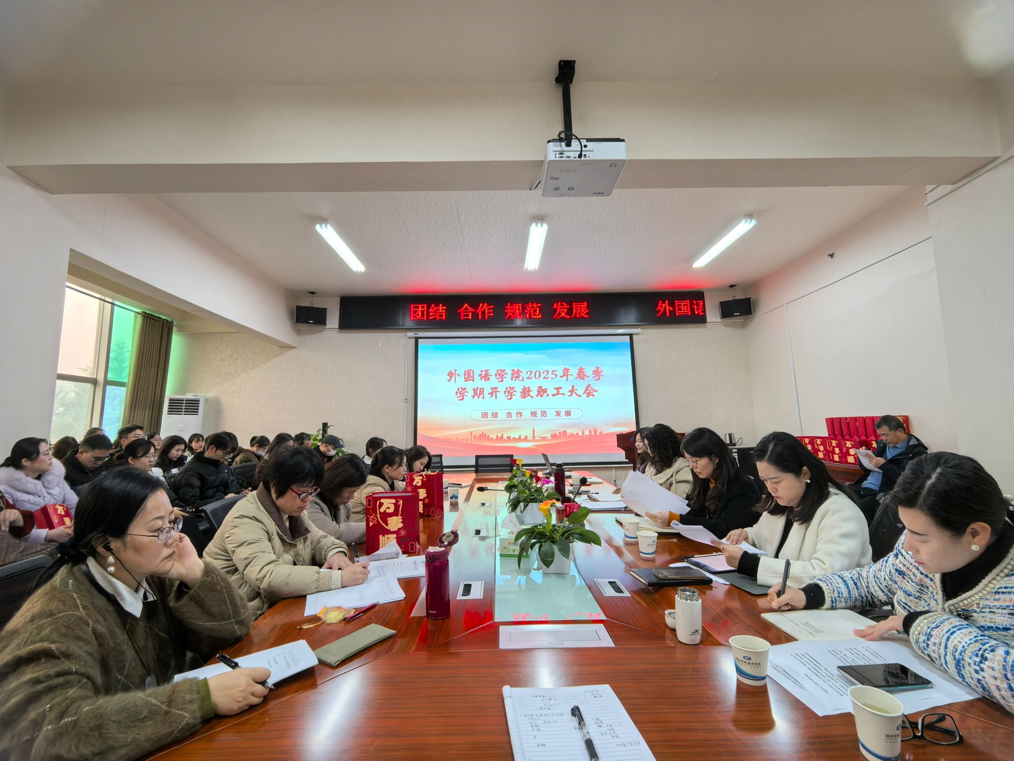 (本网讯)2月21日上午,外国语学院在办公楼315会议室召开新学期教职工大会,全体教职工齐聚一堂,共同回顾过去一年的工作成果,展望新学期的奋斗目标。会议由院党委书记凌飞主持。
