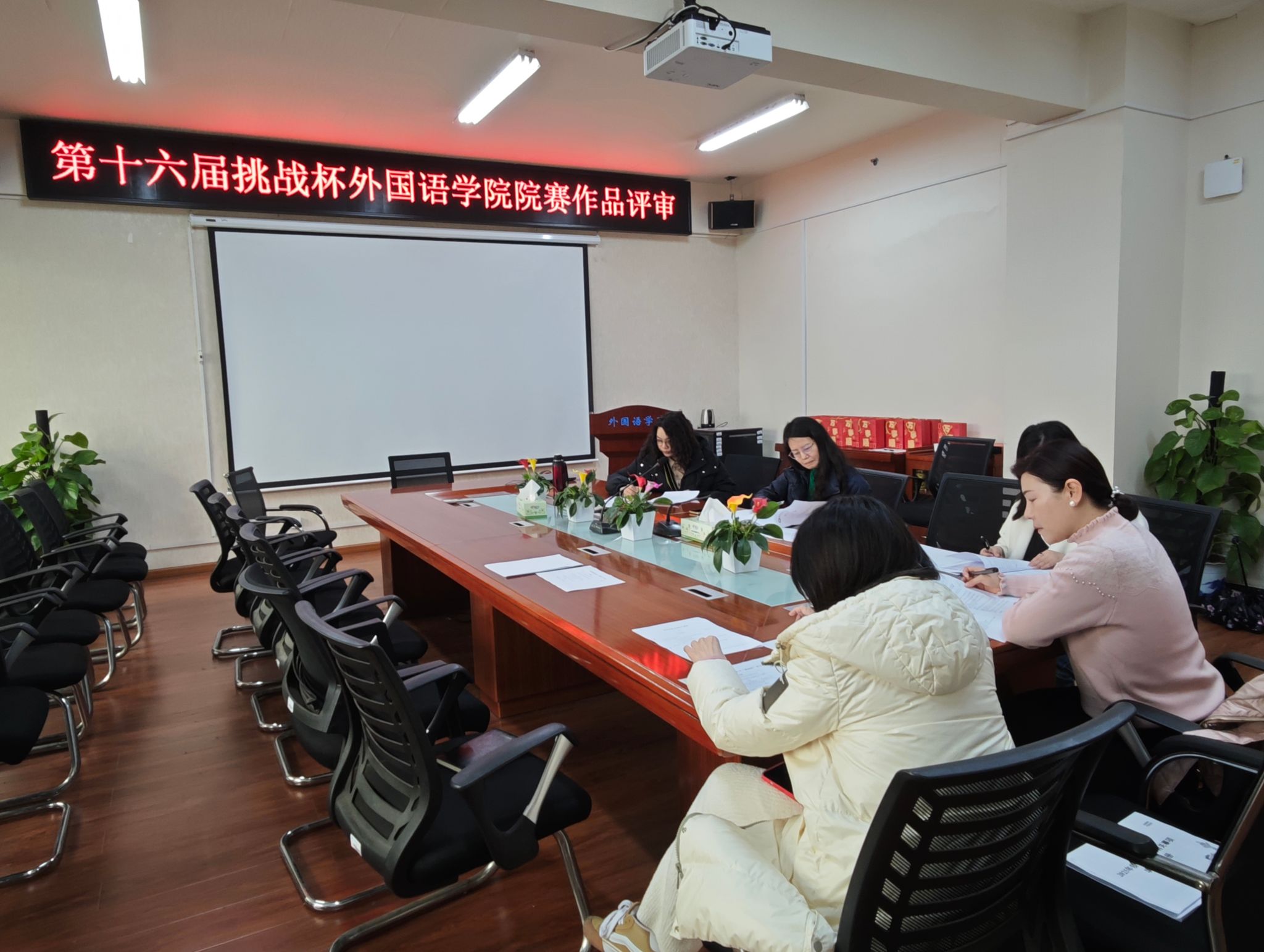 2025年3月4日,外国语学院在办公楼315办公室成功举办了第十六届挑战杯外国语学院院赛作品评审活动。此次评审活动由外国语学院党委书记凌飞、副院长汪小英、李曦、黄越以及副书记张鹏共同担任评委。经过前期广泛动员和精心组织,共收集了来自不同年级和班级的数十份参赛作品。这些作品涵盖了体育赛事志愿服务、语言服务数字化转型以及数字鸿沟与社会公平等多个领域,充分展示了外国语学院学子扎实的学术功底和敏锐的社会洞察力。